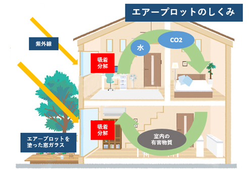 白金(プラチナ)担持超光触媒を利用した特許商品(特許第4048266号)で、お部屋の窓ガラス面に塗布すると空気中に含まれる花粉症、アトピー性皮膚炎、シックハウス、ぜんそくなどの原因物質を分解除去することができます。