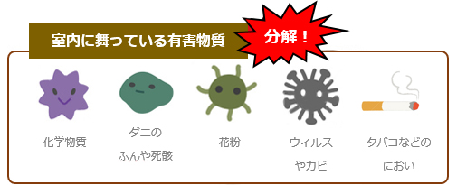 タバコの煙やニオイ、トイレ・ペットのニオイを元の分子から分解し、消臭します。